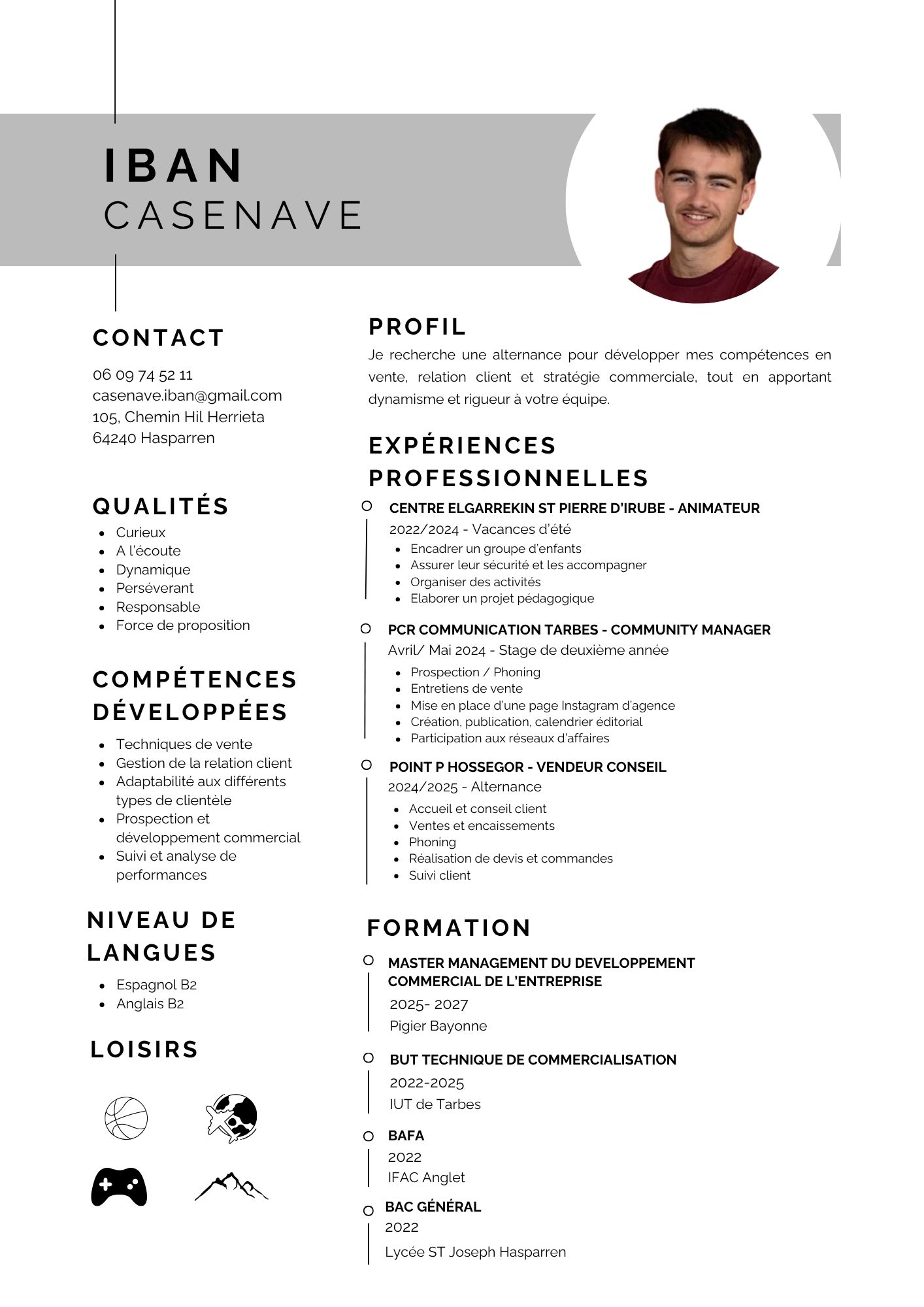 Pour bien commencer je vais me présenter brièvement, je m'appelle Iban Casenave, j'ai 20 ans et je suis en troisième année du BUT Techniques de commercialisation à Tarbes. Cette dernière année, je la réalise en alternance chez Point P à Hossegor, ce qui me permet de me rapprocher de chez moi, à Hasparren, d'où je suis originaire.