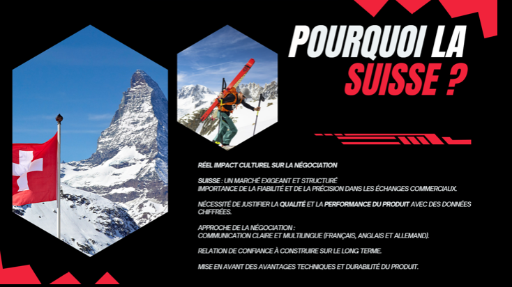 Nous avons commencé par réaliser une étude de marché approfondie afin de cerner la demande et les attentes des consommateurs suisses dans le secteur des sports d’hiver. Cette analyse nous a permis d’identifier les habitudes de consommation, les critères d’achat prioritaires ainsi que les valeurs culturelles influençant les décisions commerciales dans ce pays.
